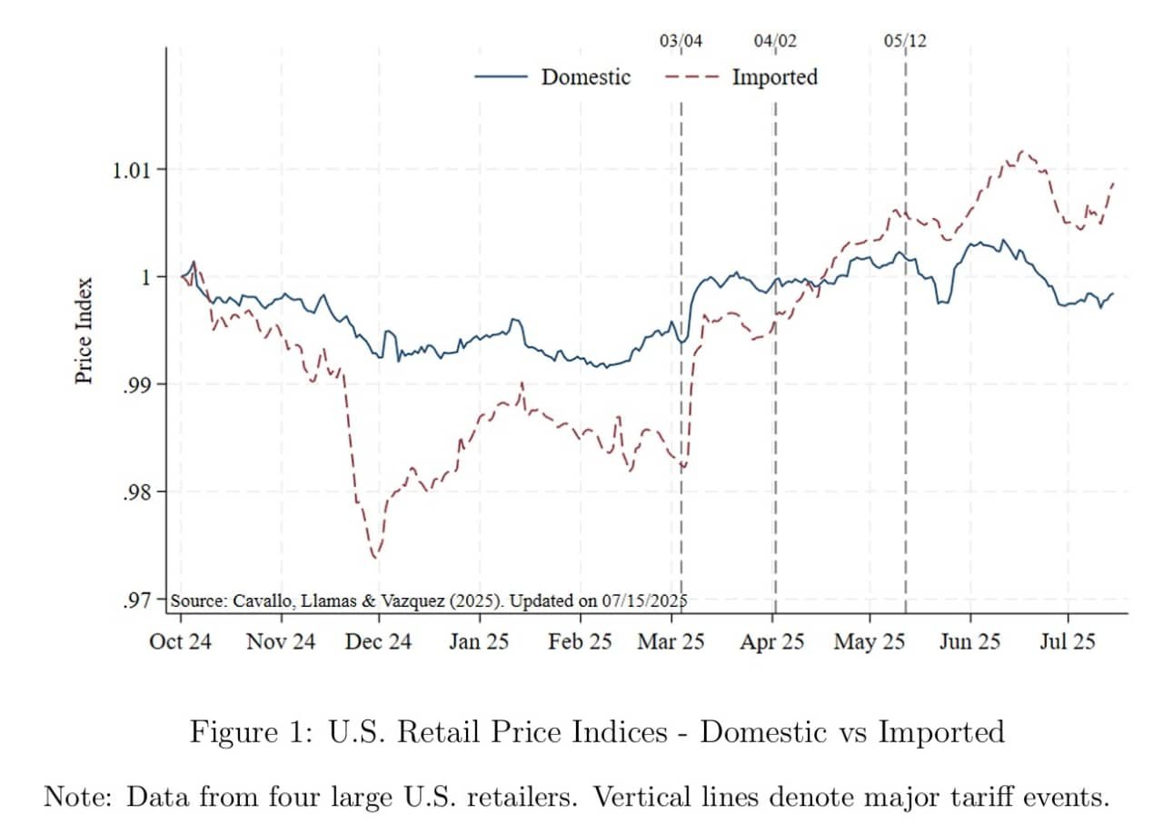 One team of economists found clear price increases for American consumers due to President Donald Trump’s tariffs. I, a chart, they compare the price tags for imported goods with those for goods made in the U.S.